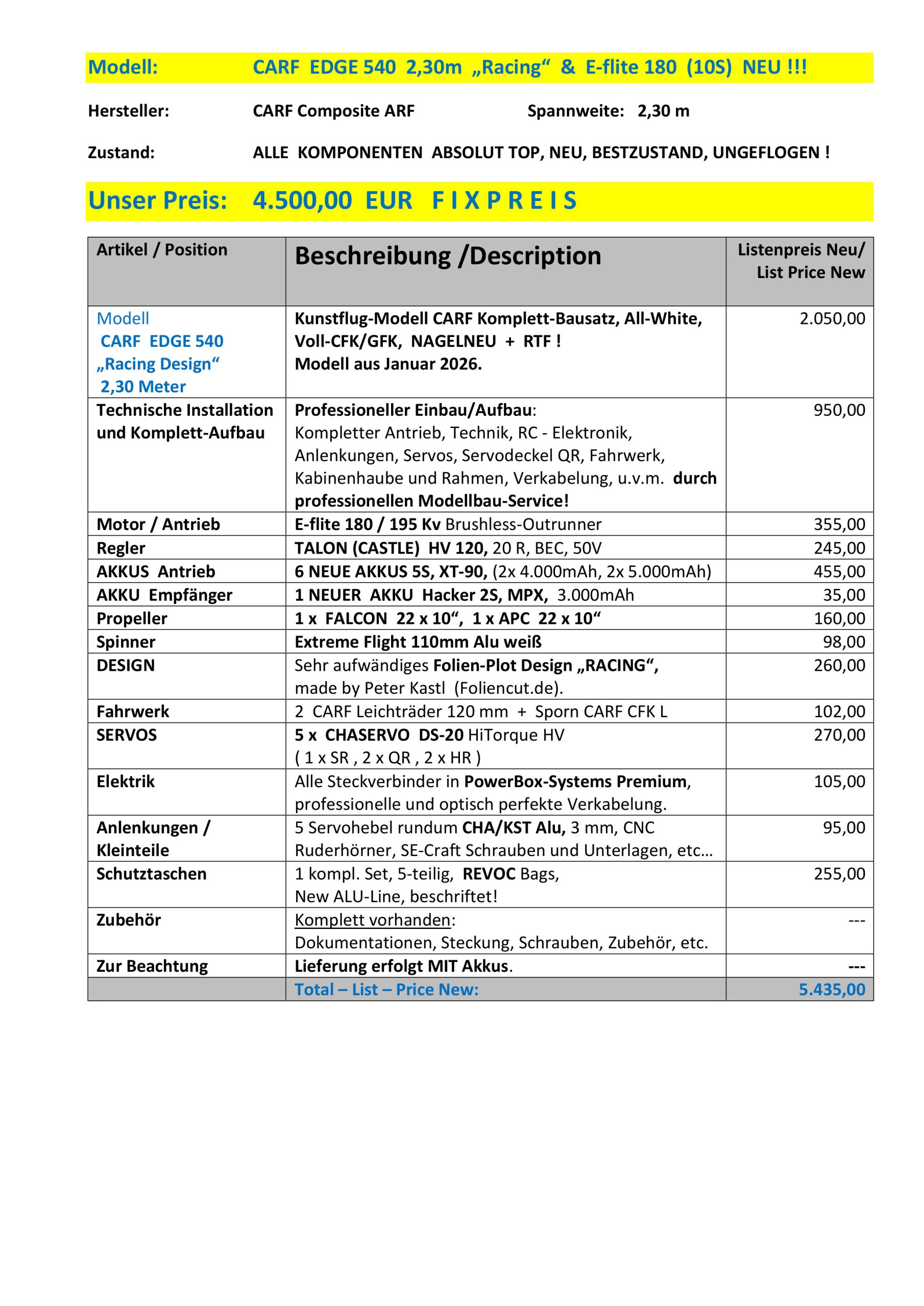 Model: CARF EDGE 540 , 2,30m , CUSTOM Scheme , E-flite 195 Kv (10S)